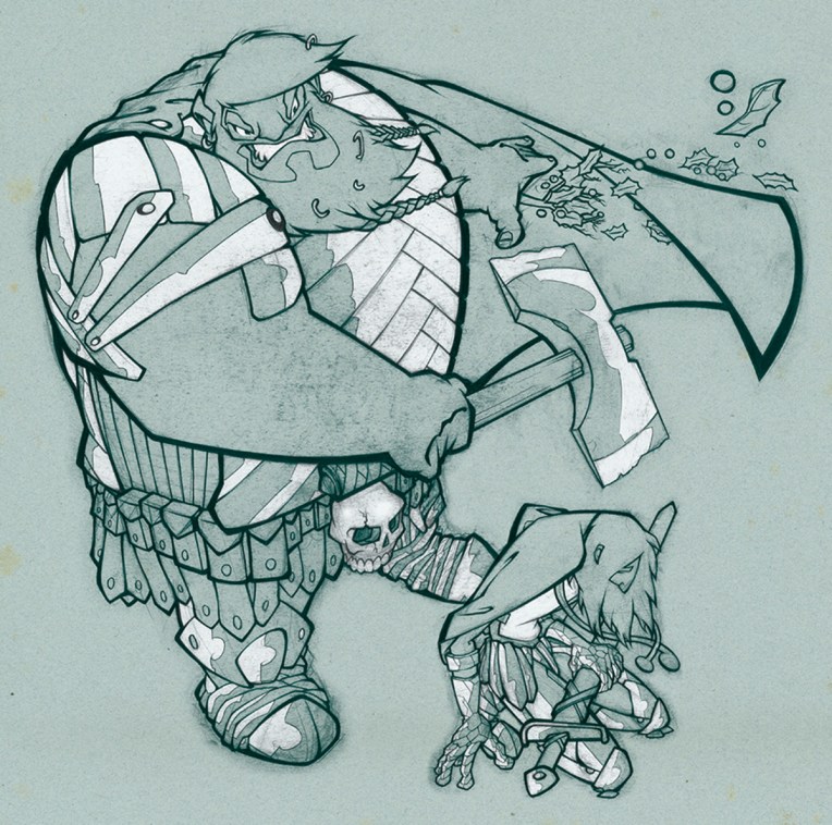 Heute präsentieren wir Euch die Gastillustration von Florian Steinl. Zu sehen ist eine Szene vom Ende der Geschichte: Der Grüne Ritter, der mit voller Wucht draufhaut, um Gawain den Kopf vom Rumpf zu trennen. Brachial! Aber wir wissen ja, wie’s ausgeht …